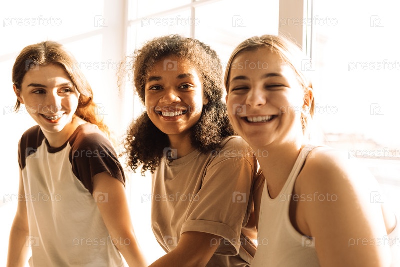 Счастливые милые девушки разных рас смеются и болтают