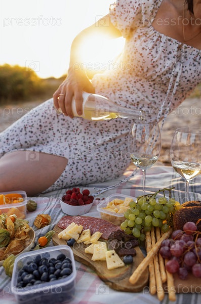 Крупный план женщины, держащей бутылку вина и наливающей алкогольный напиток в стаканы на открытом воздухе. Пикник на пляже
