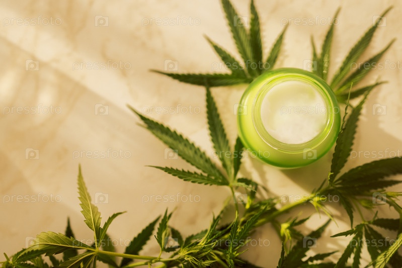 Расположение банки со сливками и листьями конопли на мраморном столе. Макет стеклянной бутылки с натуральными белыми сливками и коноплей на бежевом фоне