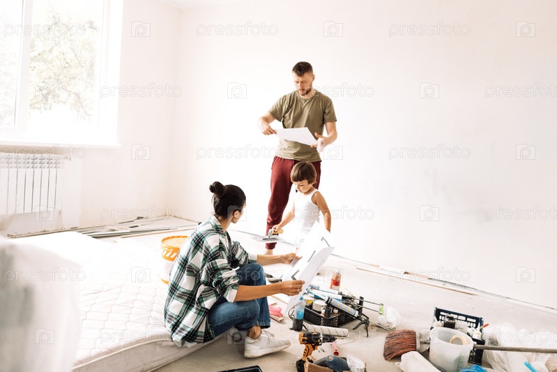 Женщина с мужем и ребенком сидят на матрасе среди строительных материалов
