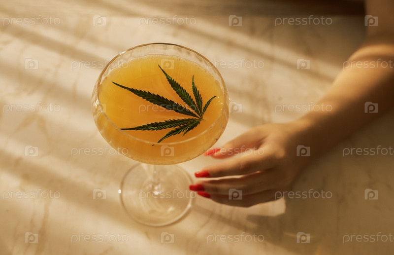 Женская рука с аккуратным красным маникюром тянется к элегантному бокалу на длинной ножке с коктейлем из листьев конопли. Вкусный желтый напиток с коноплей на мраморном столе