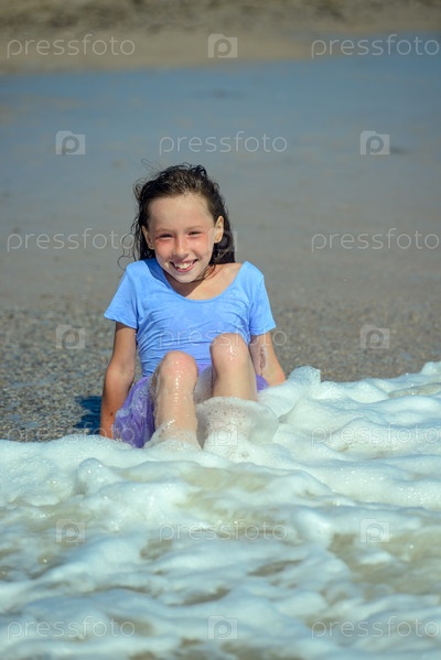Веселый ребенок в фиолетовом купальнике сидит и играет в пене морской волны в солнечный день, смотрит в камеру и улыбается. Вертикальная ориентация изображения