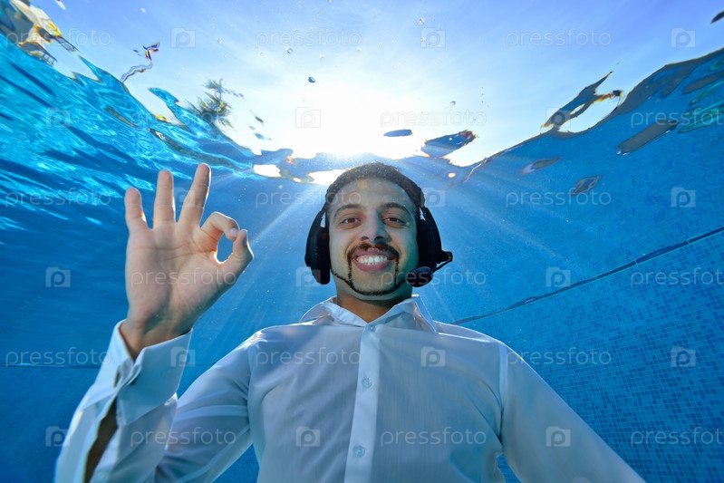 Подводный портрет молодого человека в белой рубашке с наушниками на голове, который плавает под водой в бассейне, смотрит в камеру и улыбается. Крупным планом. Подводная фотография