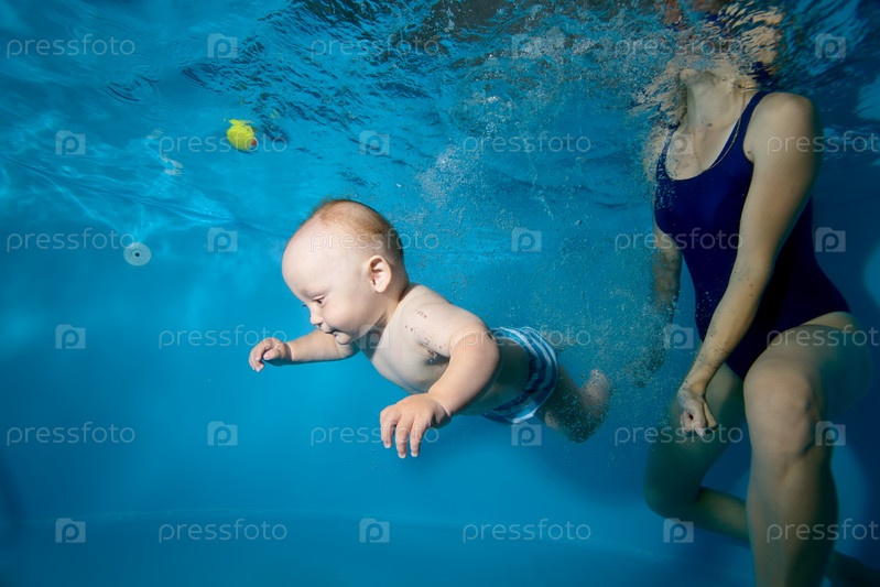 Малыш плавает с мамой под водой в бассейне