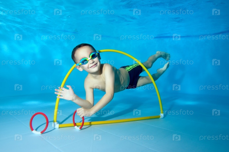 Красивый маленький мальчик ныряет под воду в детском бассейне. Он плавает через обруч, достает игрушки. Активный счастливый ребенок. Здоровый образ жизни. Уроки плавания под водой. Семейный вид спорта