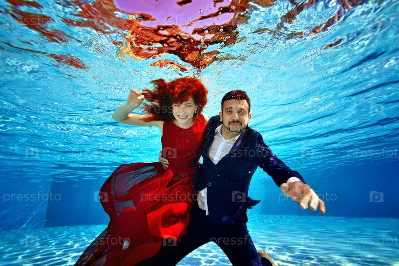 Красивая девушка в красном платье и парень в костюме плавают под водой в бассейне в солнечный день. Они улыбаются и позируют перед камерой на синем фоне. Модная подводная съемка