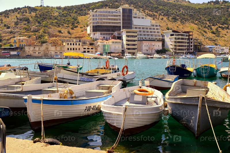Деревянные лодки стоят у причала на фоне отеля в солнечный день. Крым. Горизонтальный вид