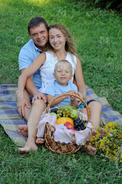 Папа, мама и ребенок сидят друг за другом на траве в парке на закате возле корзины с фруктами