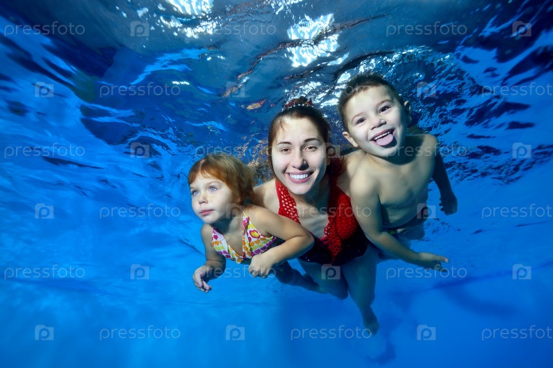 Спортивная семья: улыбающаяся мать и двое ее маленьких детей плавают под водой в бассейне