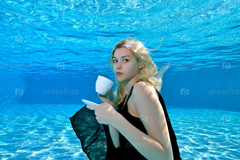 Молодая красивая блондинка позирует под водой в бассейне с чашкой белого кофе в руках