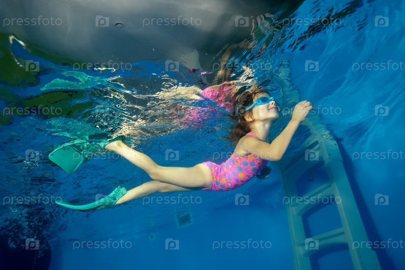 Спортивная маленькая девочка плавает с плавниками под водой со дна бассейна на поверхность и смотрит вверх. Портрет. Стрельба под водой. Альбомная ориентация