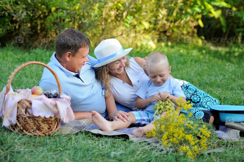 Счастливые папа, мама и маленький сын отдыхают и веселятся на траве на закате во время загородного пикника