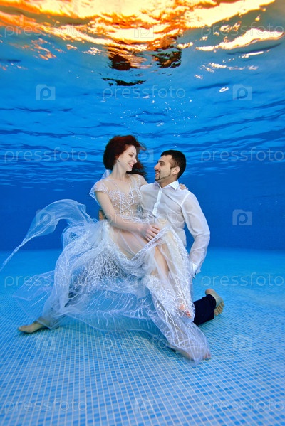 Сексуальная невеста в свадебном платье сидит на коленях жениха под водой на дне бассейна на фоне яркого заката на поверхности воды. Они улыбаются и смотрят друг на друга