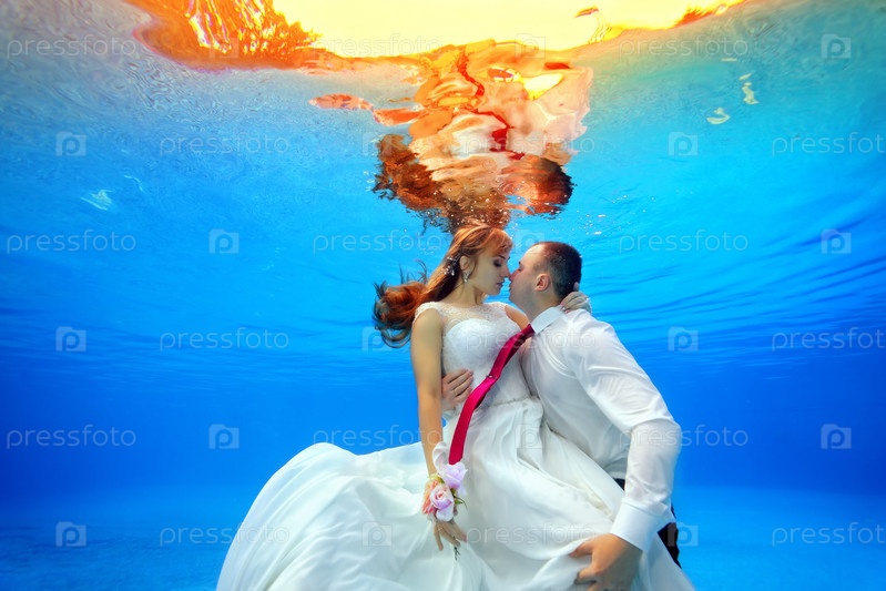Пара в свадебных платьях обнимается и целуется под водой в бассейне на закате. Горизонтальный вид. Стрельба из-под воды