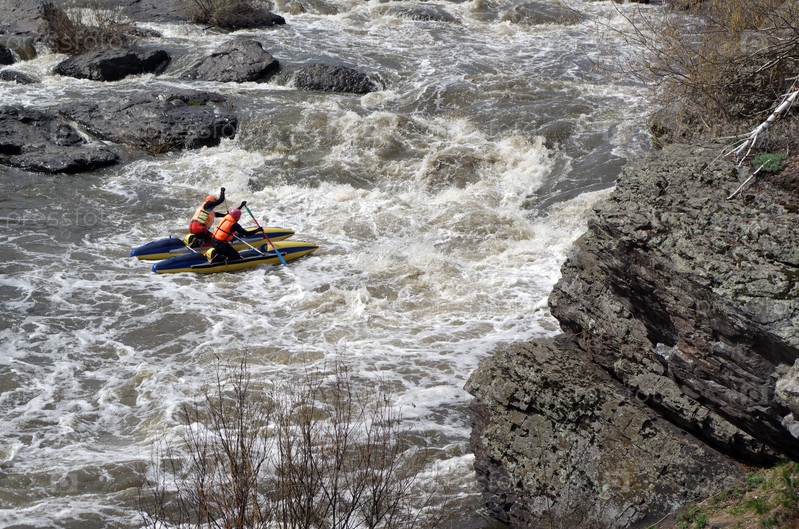 Два спортсмена на катамаране в бурной реке среди скал