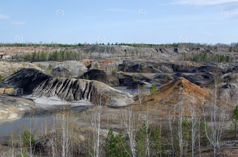 Пустынный пейзаж с цветной почвой и редкими деревьями у карьера огнеупорной глины