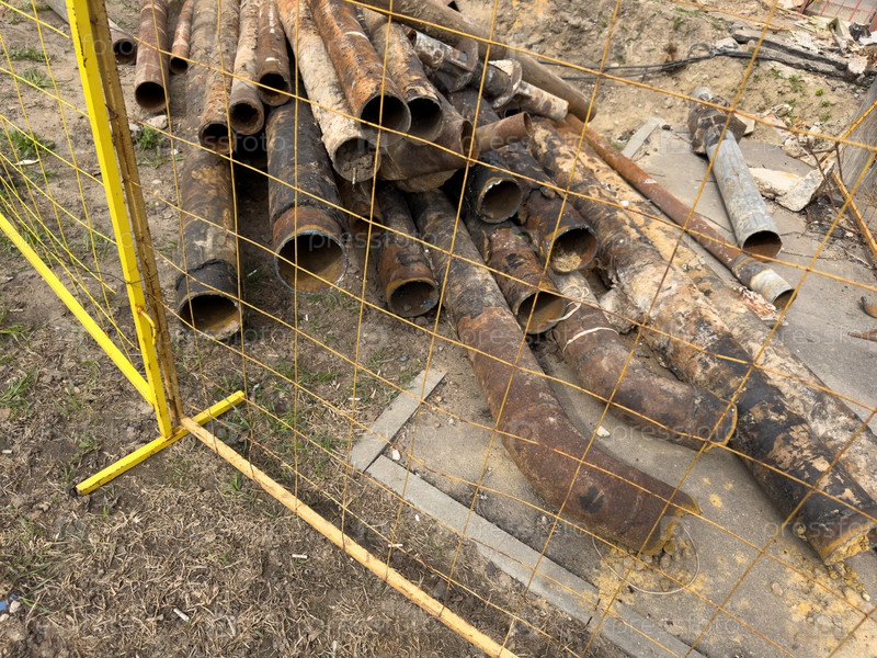 Ржавые металлические трубы лежат на земле