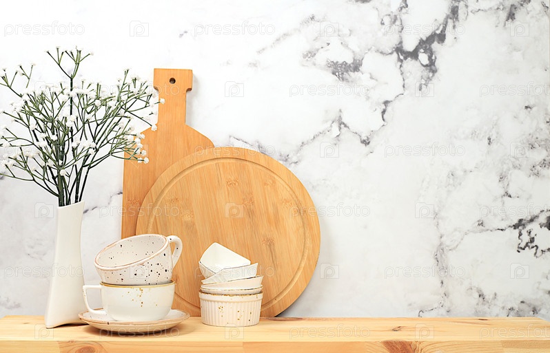 Кухонный стол с посудой, разделочными досками и весенними цветами. Простой интерьер домашней кухни, макет для дизайна и демонстрации продукции, концепция нулевых отходов и здорового образа жизни,
