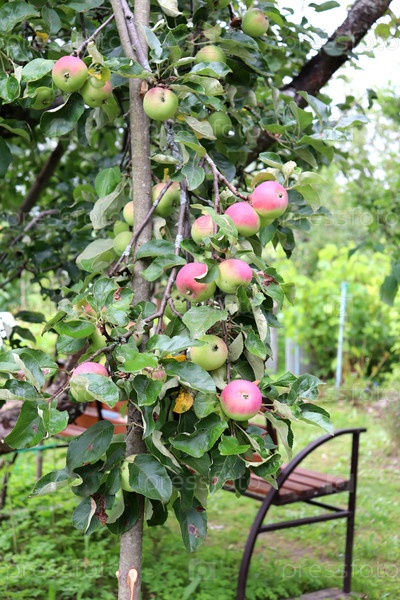 Ветка со спелыми яблоками сорт Услада на фоне сада