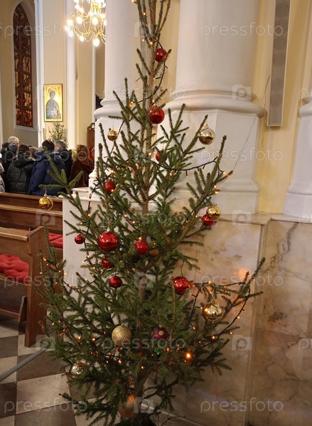 Рождественский интерьер и люди в Соборе Непорочного зачатия Девы Марии в Москве