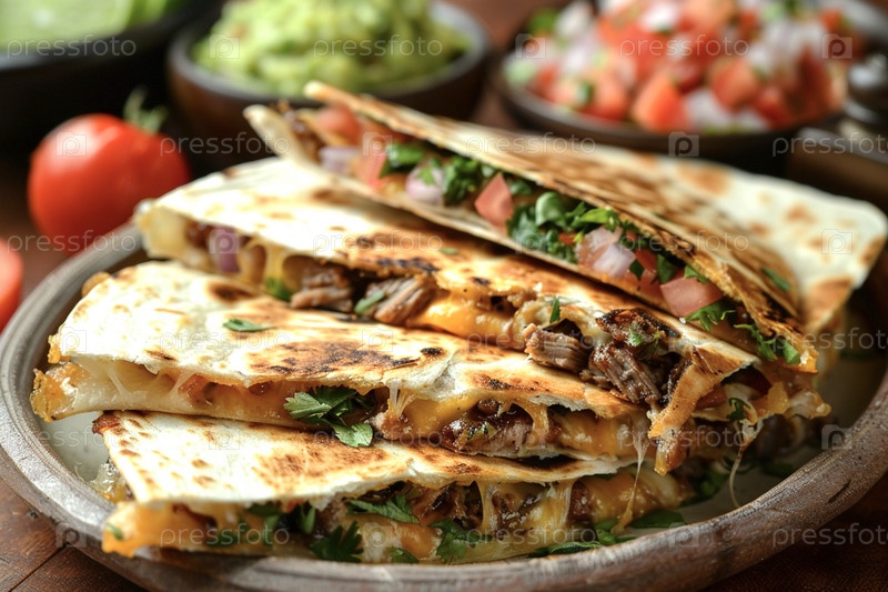 Кесадильи — это тонкие лепешки, обжаренные с начинкой из сыра, мяса или овощей, которые часто подают с сальсой и гуакамоле