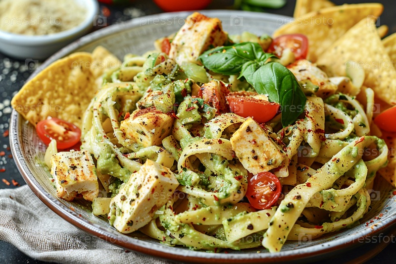 Паста из авокадо и брокколи с помидорами, зеленью, луком и кукурузными чипсами