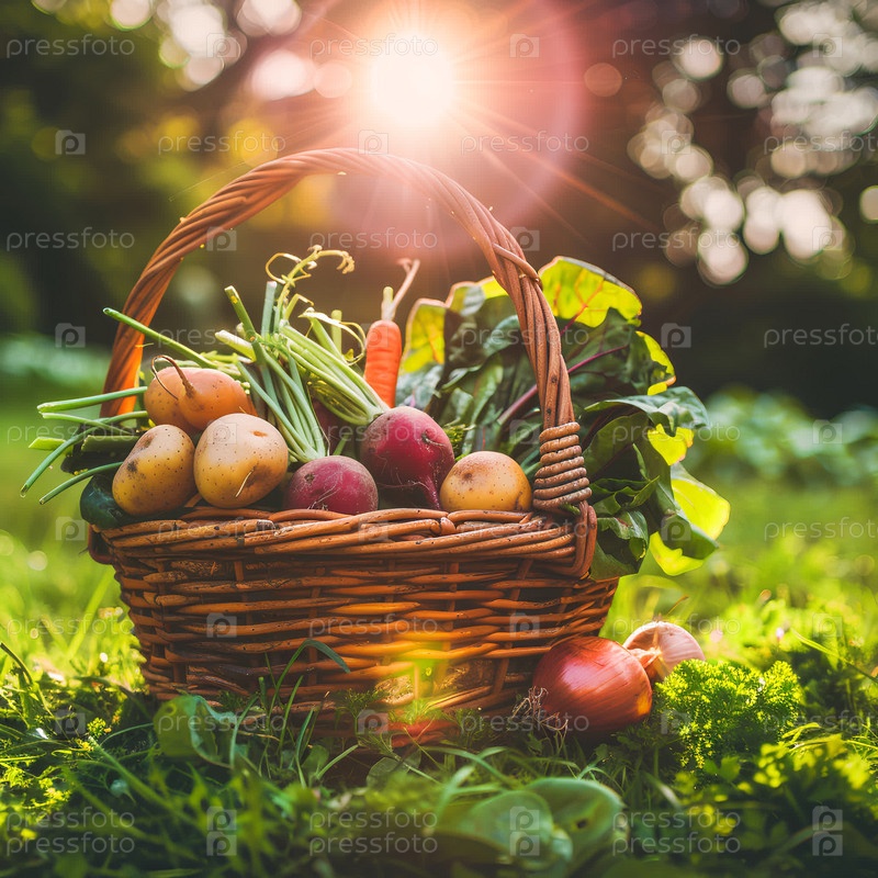 Корзина со свежими овощами (морковь, картофель, свекла, зелень) в саду на солнечном лугу
