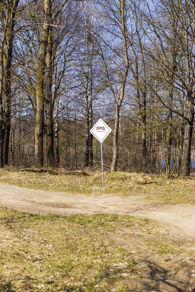 Выстрел улицы в русской деревне. На вывеске написано: пруд. На открытом воздухе
