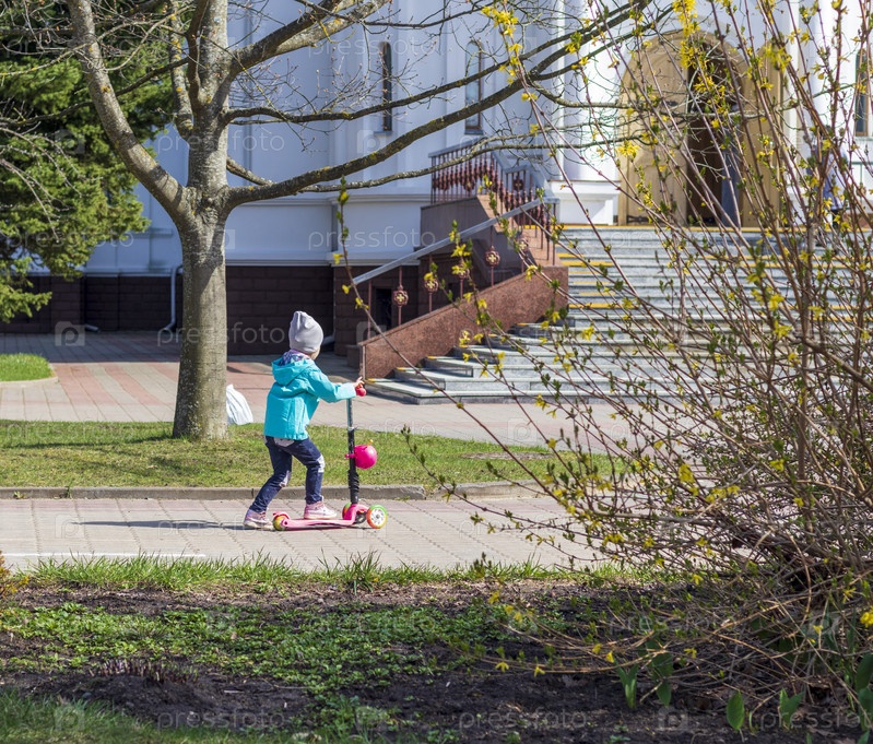 Маленькая девочка катается на скутере по улице. Концепция