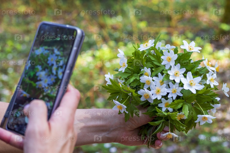 Женщина фотографирует свежие натуральные белые цветы на свой мобильный телефон, Концепция