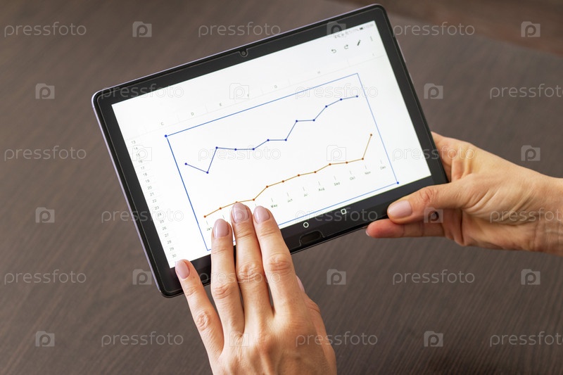 Крупный план женщины с красивыми руками, использующей планшет и изучающей отчет о продажах ипотеки. Рынки
