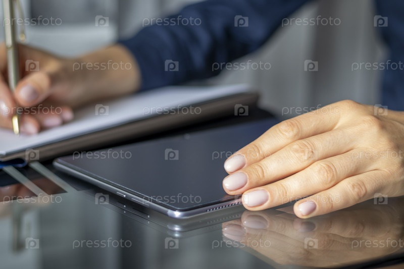 Крупный план женщины с красивыми руками в деловой одежде, работающей на планшете в офисе и делающей заметки. Промышленность