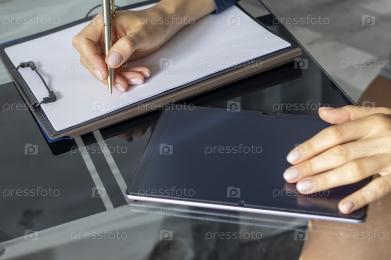 Крупный план женщины с красивыми руками в деловой одежде, работающей на планшете в офисе и делающей заметки. Городской