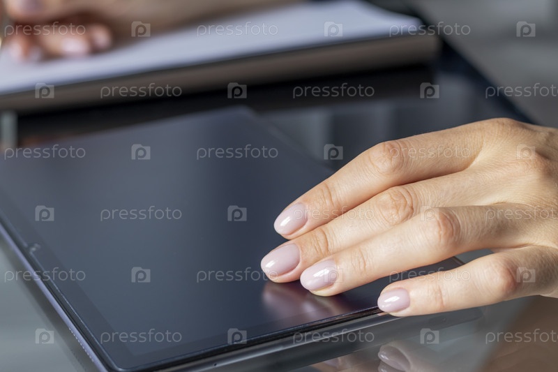 Крупный план женщины с красивыми руками в деловой одежде, работающей на планшете в офисе и делающей заметки. Городской