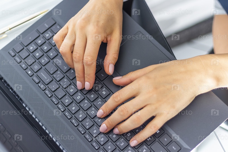 Крупный план женщины с красивыми руками в деловой одежде, работающей на ноутбуке в офисе, снимок сверху