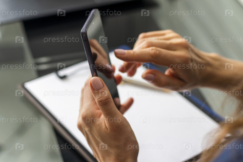 Крупный план женщины с красивыми руками, сидящей в конференц-зале во время деловой встречи и пользующейся телефоном. Бизнес