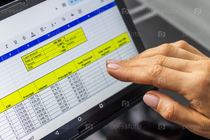 Крупный план женщины с красивыми руками, использующей планшет, изучающей таблицу амортизации ипотечного кредита. Банковское дело