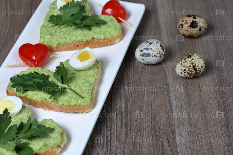 Сэндвичи на завтрак. Ломтики хлеба в форме сердечек, намазанные молотым авокадо. Украшается вареными перепелиными яйцами, петрушкой и помидорами. Развернутый на белой прямоугольной тарелке