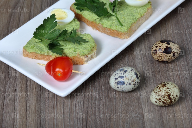 Сэндвичи на завтрак. Ломтики хлеба в форме сердечек, намазанные молотым авокадо. Украшается вареными перепелиными яйцами, петрушкой и помидорами. Развернутый на белой прямоугольной тарелке