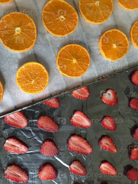 Мандарины и клубнику нарезают ломтиками. разложили на пищевой бумаге. Для сушки и украшения десертов