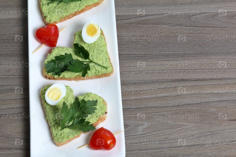 Сэндвичи на завтрак. Ломтики хлеба в форме сердечек, намазанные молотым авокадо. Украшается вареными перепелиными яйцами, петрушкой и помидорами. Развернутый на белой прямоугольной тарелке