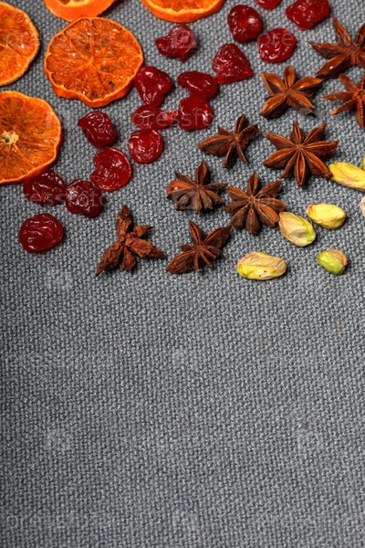 Сушеные мандарины и клубнику нарезаем кусочками для украшения десерта. Рядом сухая вишня, фисташки и звездочки аниса