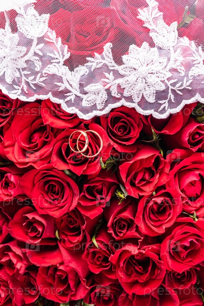 Фоновое изображение для свадебного дизайна или макета. Два золотых обручальных кольца на фоне букета красных роз. белая фата. Вид сверху. Место для копирования