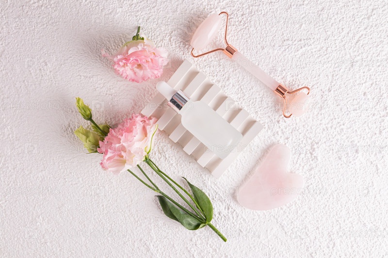 Белый матовый флакон косметики, массажный ролик из розового кварца и скребок гуаша лежат на рельефном подиуме с розовыми цветами. Вид сверху