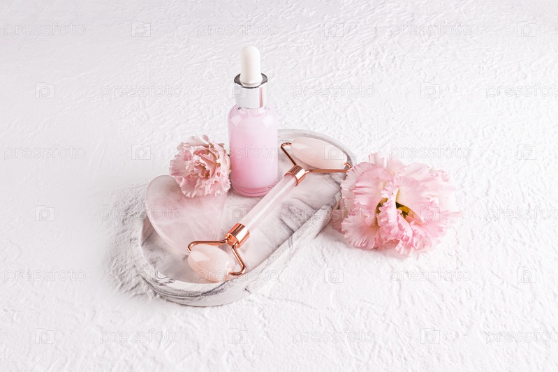 Роликовый массажер из розового кварца, скребок гуаша, масло для массажа и ухода в матовом флаконе на белом керамическом подносе. Вид сверху. Лифтинговый эффект