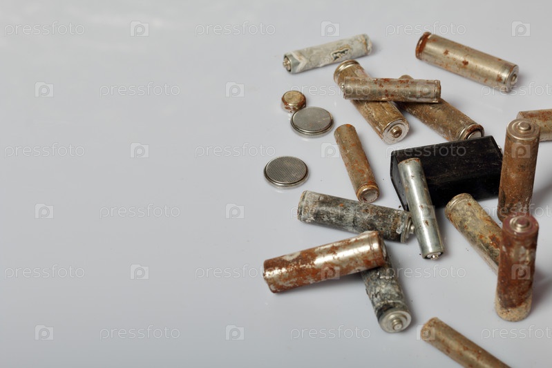 Использованные батарейки на белом фоне. Утилизация отработанных аккумуляторов. Защита окружающей среды. День Земли