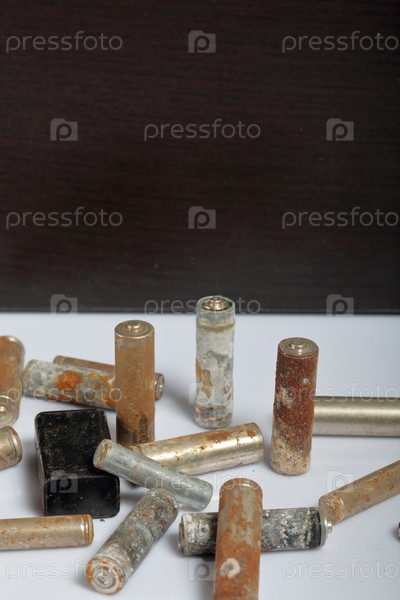 Использованные батарейки на белом фоне. Утилизация отработанных аккумуляторов. Защита окружающей среды. День Земли