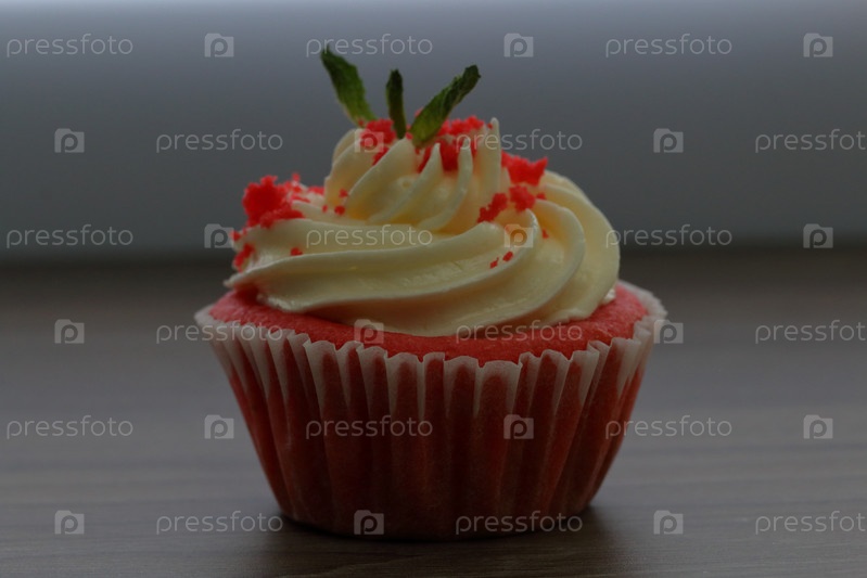 Красный бархатный кекс. Готовые лепешки лежат на столе. Украшен листьями мяты