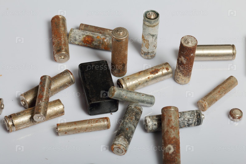 Использованные батарейки на белом фоне. Утилизация отработанных аккумуляторов. Защита окружающей среды. День Земли