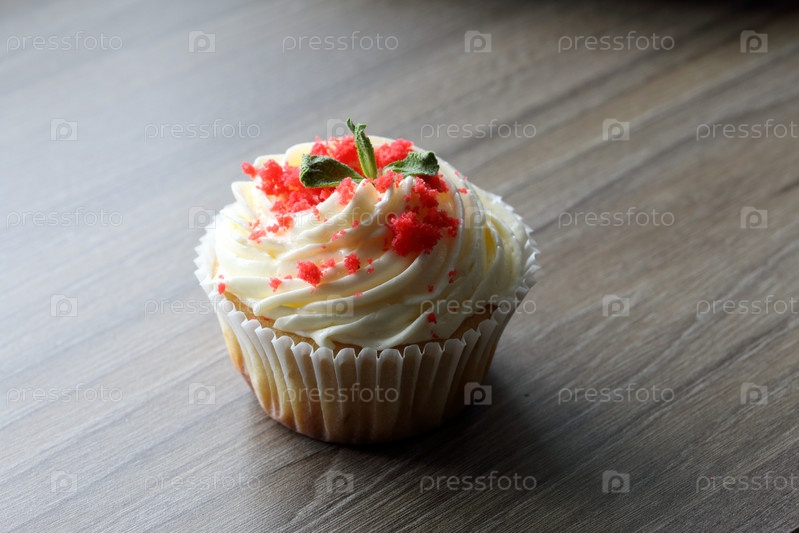 Красный бархатный кекс. Готовые лепешки лежат на столе. Украшен листьями мяты